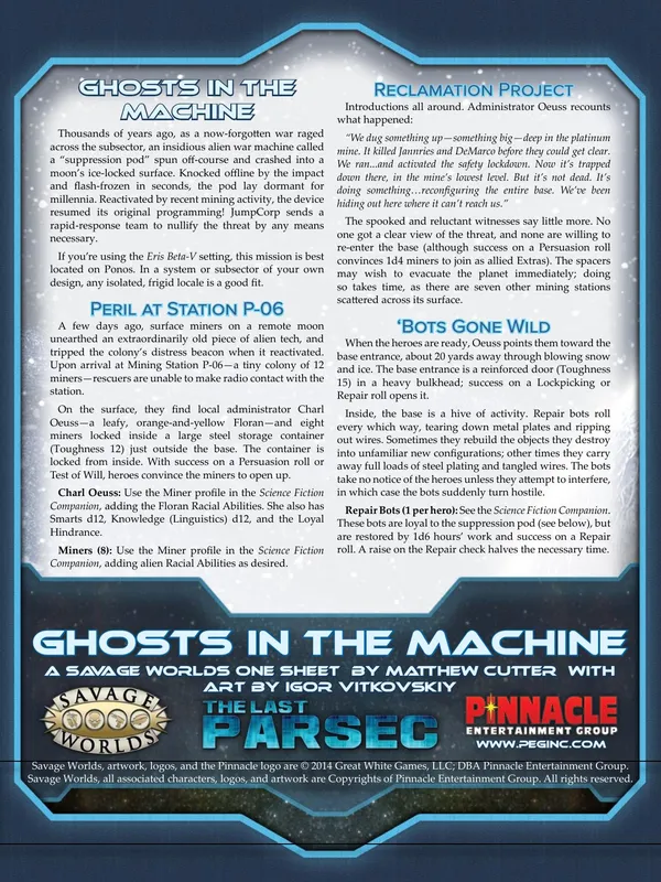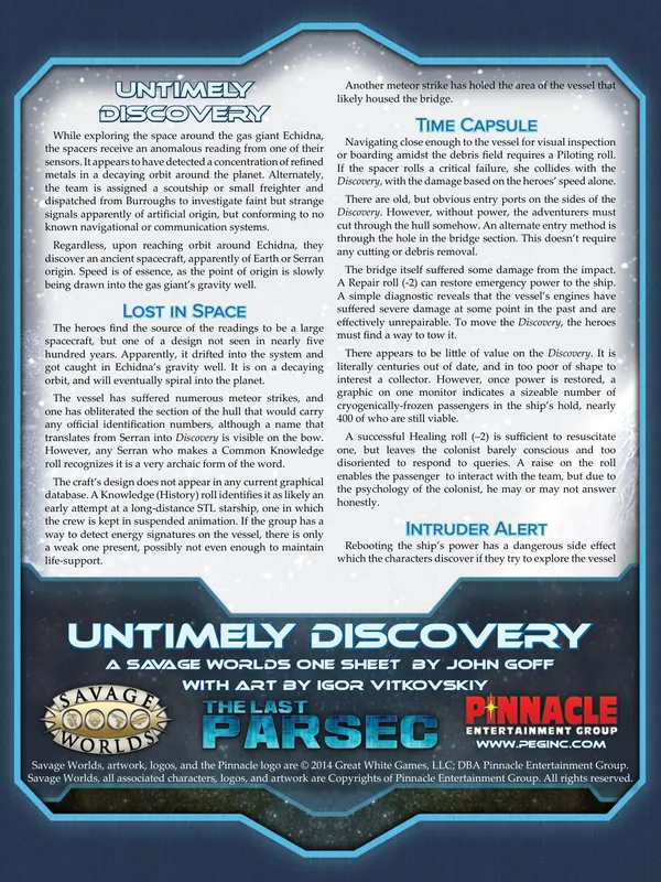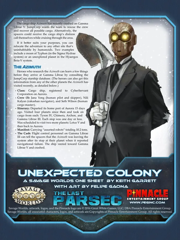 Characters cross the cosmos under the auspices of JumpCorp, an intergalactic megacorp that contracts exploration, security, bounty hunting, transportation, and everything in between. Adventures take explorers from system to system and planet to planet, finding strange new civilizations, discovering terrifying creatures, and battling pirates, hostile aliens, rival corporations, and stranger things!