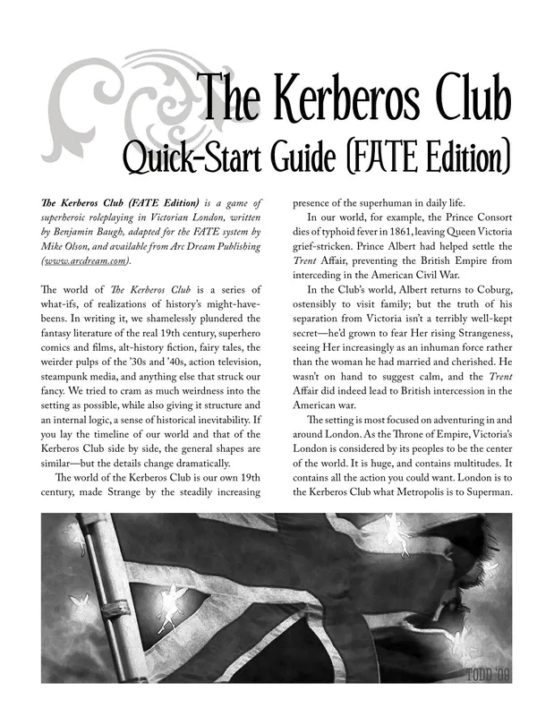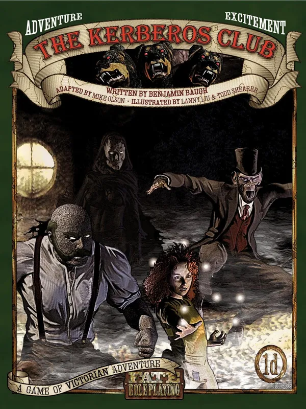 The Kerberos Club (FATE Edition) is a complete roleplaying game for thrilling superheroic and steampunk action in Victorian London. It includes a treatment of Victorian society in its every particular, espeically the incredible and sometimes awful changes that "the Strangeness" comes to wreak upon Queen and Country alike.