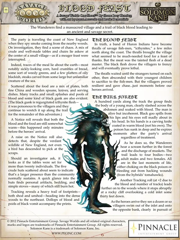 The Savage World of Solomon Kane is a roleplaying game based upon the incredible works of Robert E. Howard, author of Conan the Barbarian®, Kull the Conqueror®, and countless other great heroes and heroines.